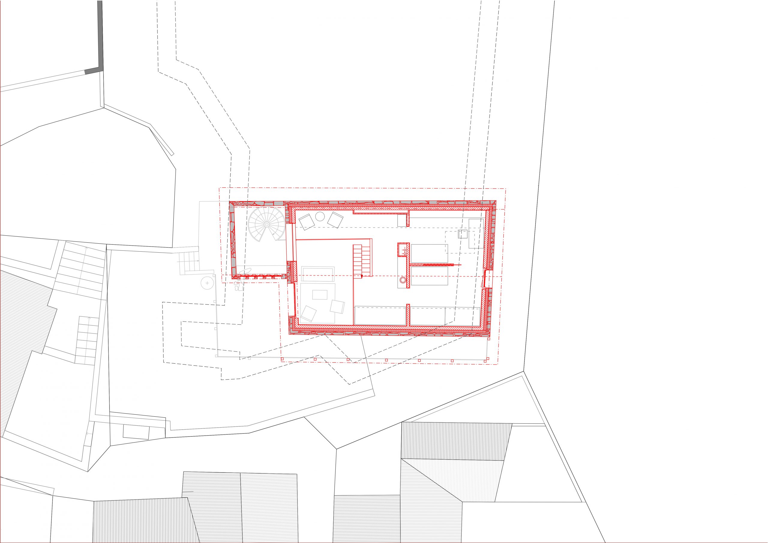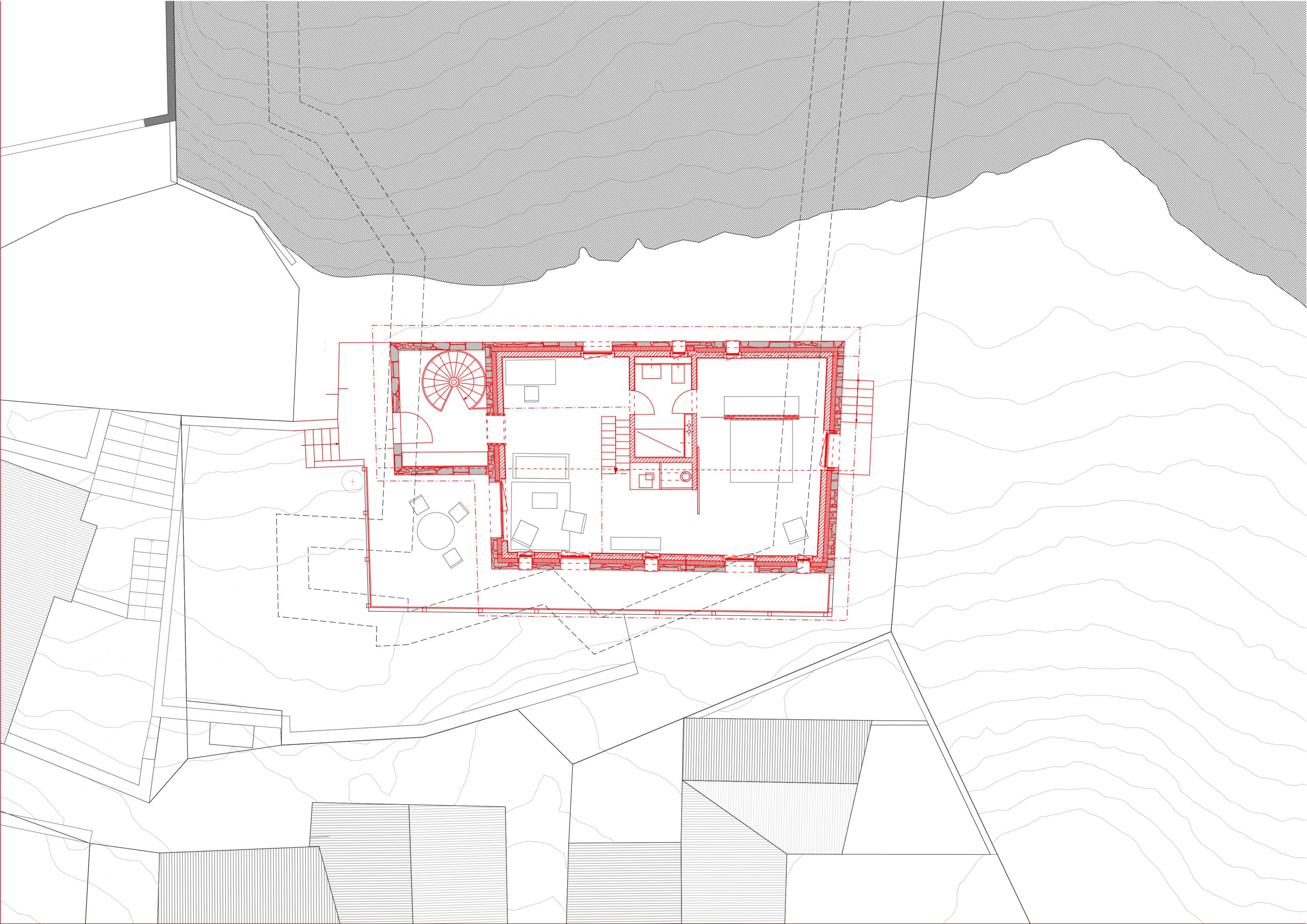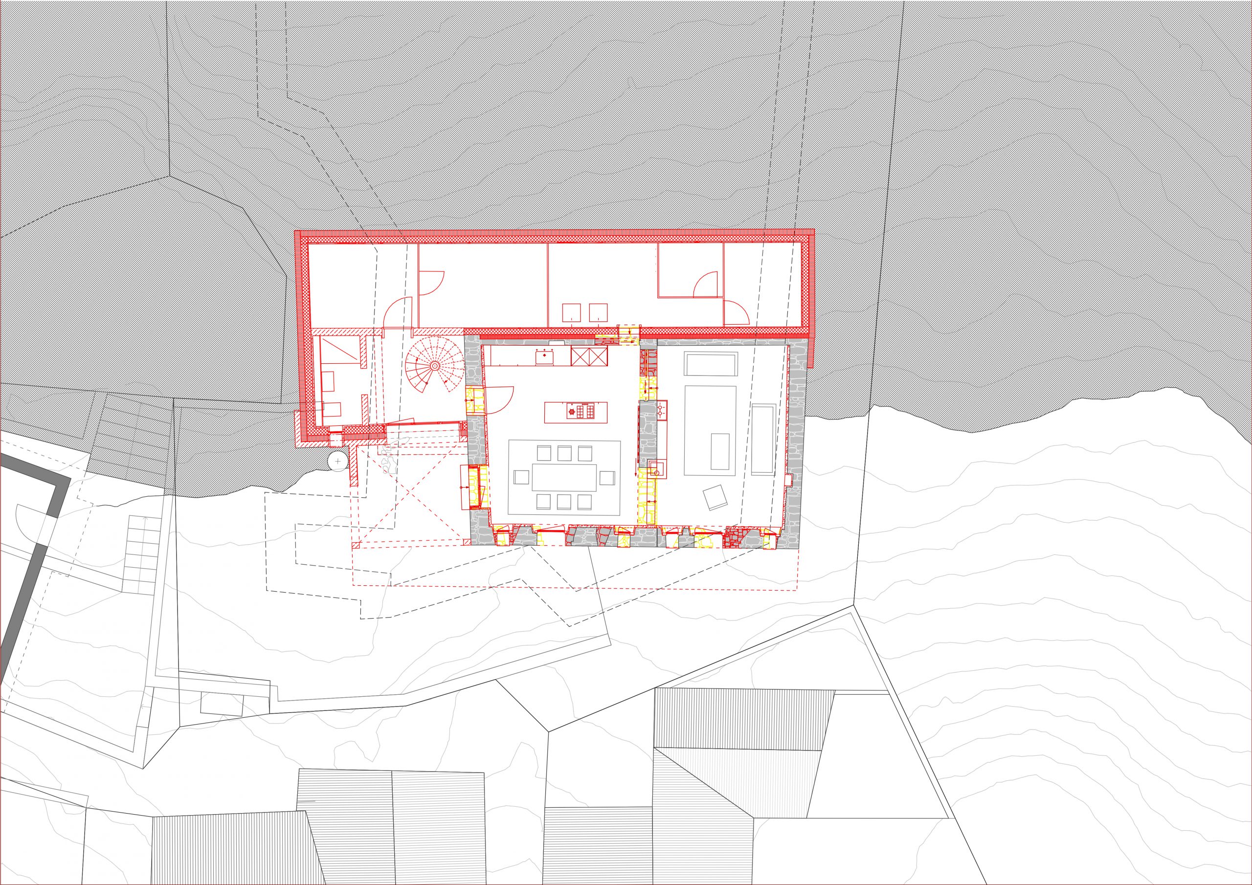 Die Herausforderung den Bestand in seinem ursprünglichen Charakter zu bewahren, durch das Belassen seiner markanten Aussenhülle aus Stein, dem Ergänzen und Einfügen einzelner Öffnungen und Anbauten, welche durch das neue Raumprogramm gefordert sind, sind die Parameter die es zu erfüllen galt.
